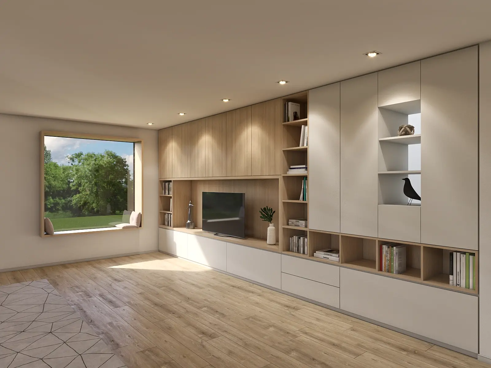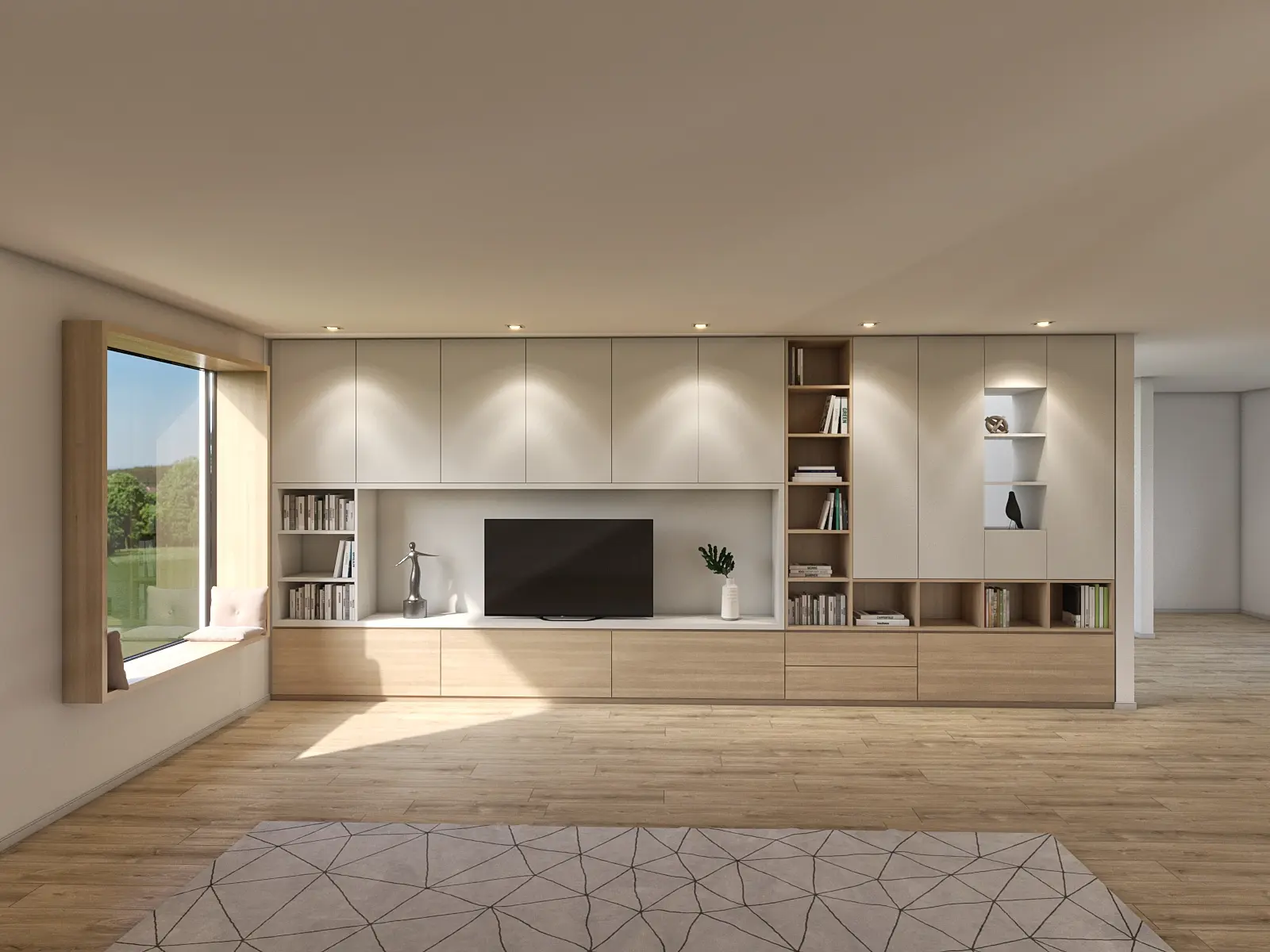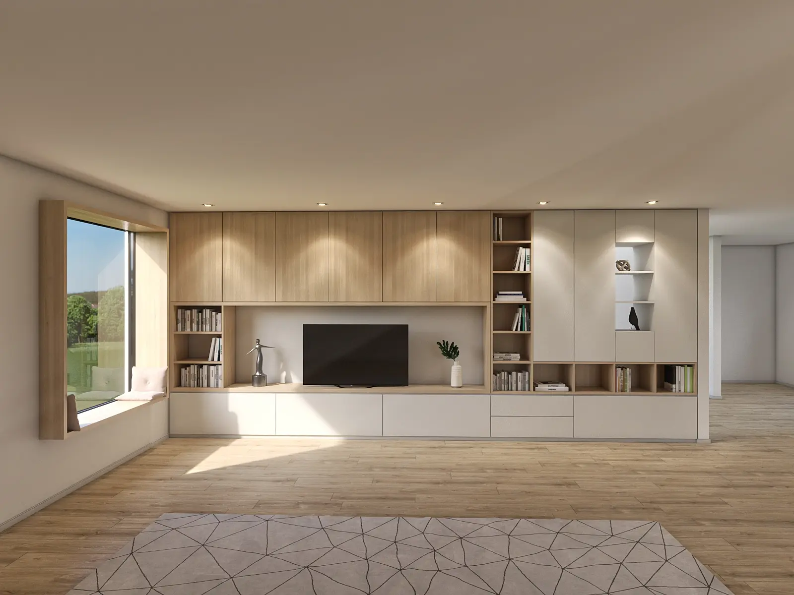 Die Schrankwand wurde nicht isoliert dargestellt, sondern im vollständigen Raumkontext – mit Licht, Boden, angrenzenden Wänden. Genau das ist der Unterschied zwischen einer technischen Zeichnung und einer Entscheidungsgrundlage.