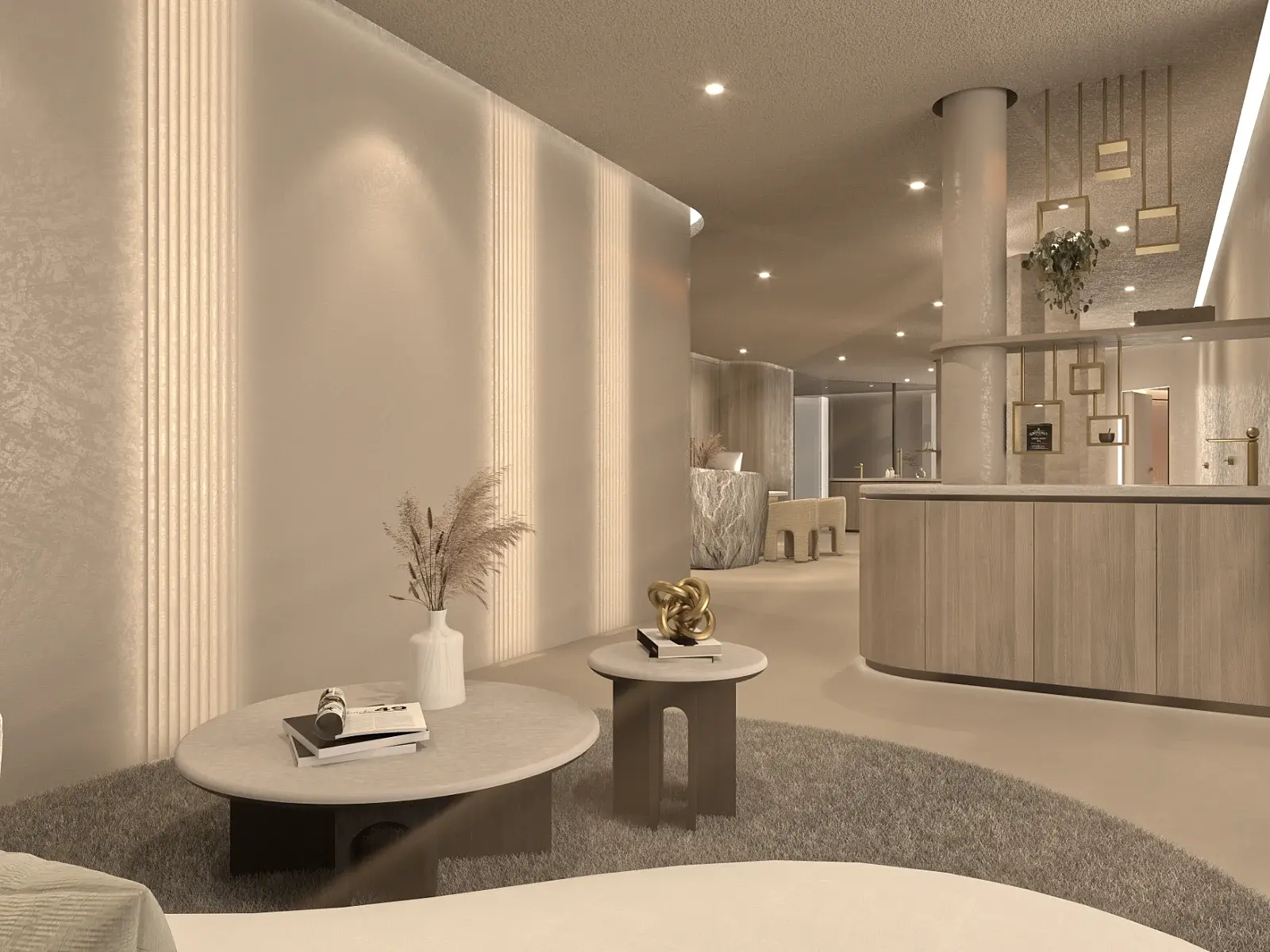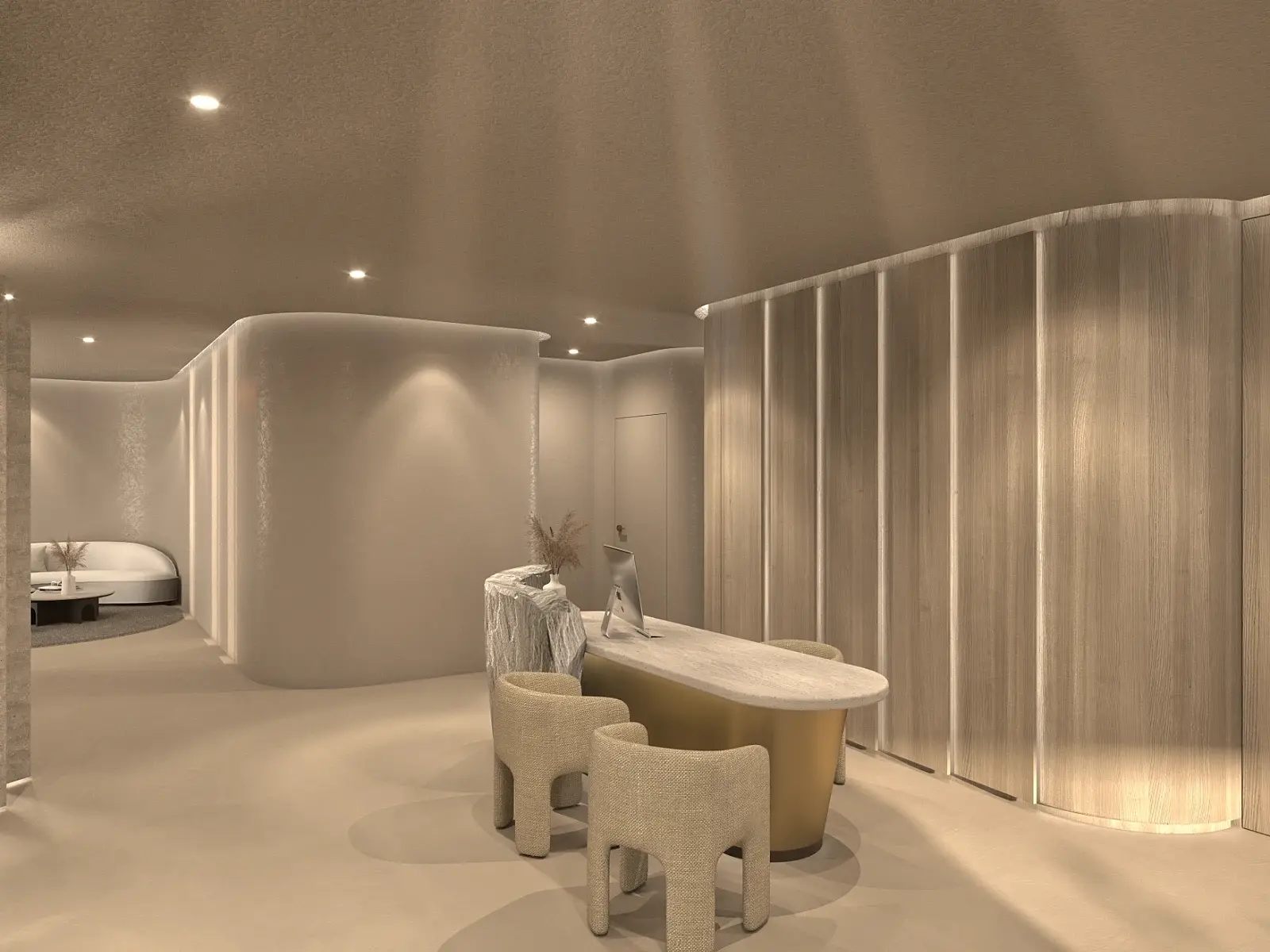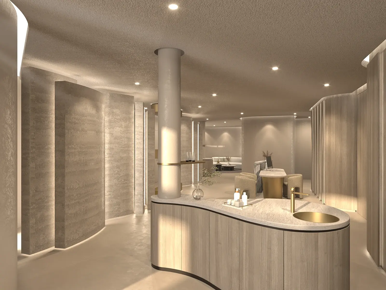Ein Spa-Bereich für ein Hotel bei Meeran, Tirol – entwickelt vom österreichischen Architekturbüro Archifaktur. Empfangsbereich, Behandlungsräume und ein privater Spa sollten in einer organischen, fließenden Formensprache visualisiert werden. Die Grundlage: 2D-Pläne und ein gestalterisches Moodboard.